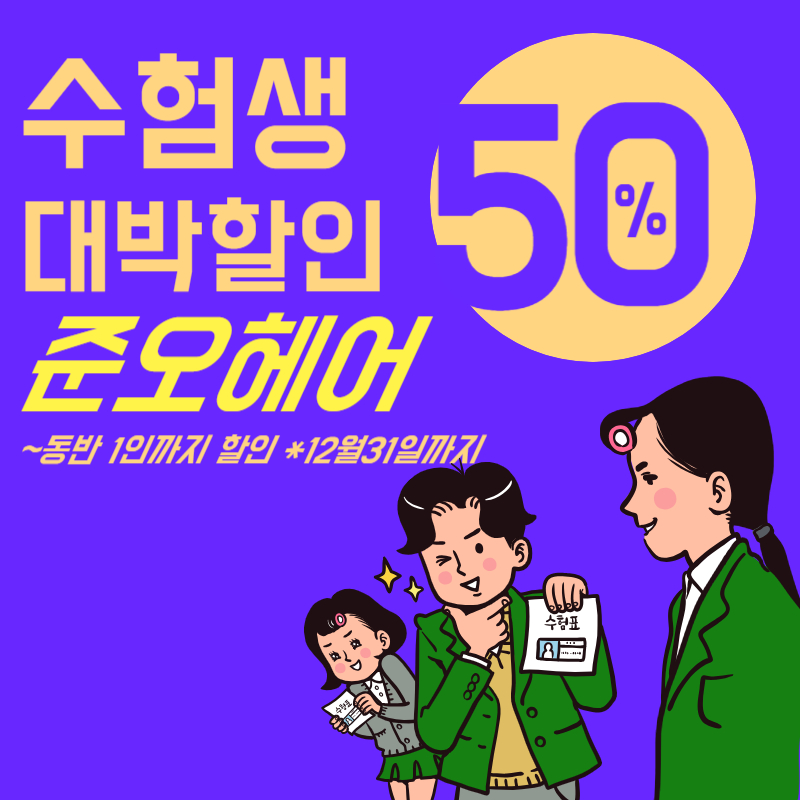 준오헤어 수원 로데오점에서 수험생과 동반고객 1 모두 50% 할인받으실 수 있습니다.
